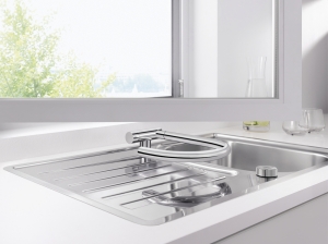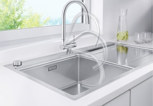 Складной смеситель в современном стиле для установки перед окном Blanco Coressa-F выпускается в двух вариантах: с рычагом справа и слева. Очень удобный смеситель, который подойдет вам, если вы решили установить кухонную мойку перед окном: высокий излив смесителя легко складывается, наклоняясь вперед.